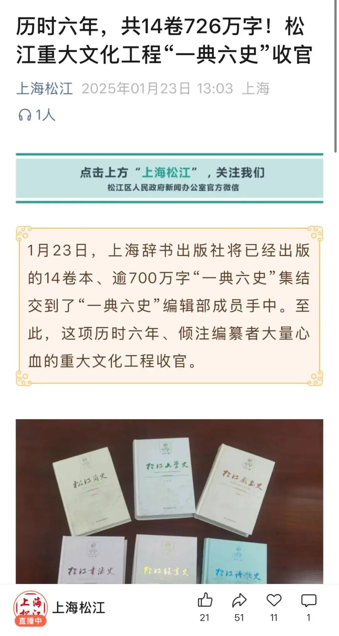 历时六年,陆军馆员策划并主持编纂的松江重大文化工程“一典六史”收官